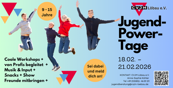 Vom 18.02. – 21.02.2026 gehen die Jugend-Power-Tage in die dritte Runde. 4 Nachmittage voll mit tollen Workshops, leckeren Snacks, Programm & Gemeinschaft erwarten Dich und 30 andere Kids & Teens aus Löbau und Umgebung.
